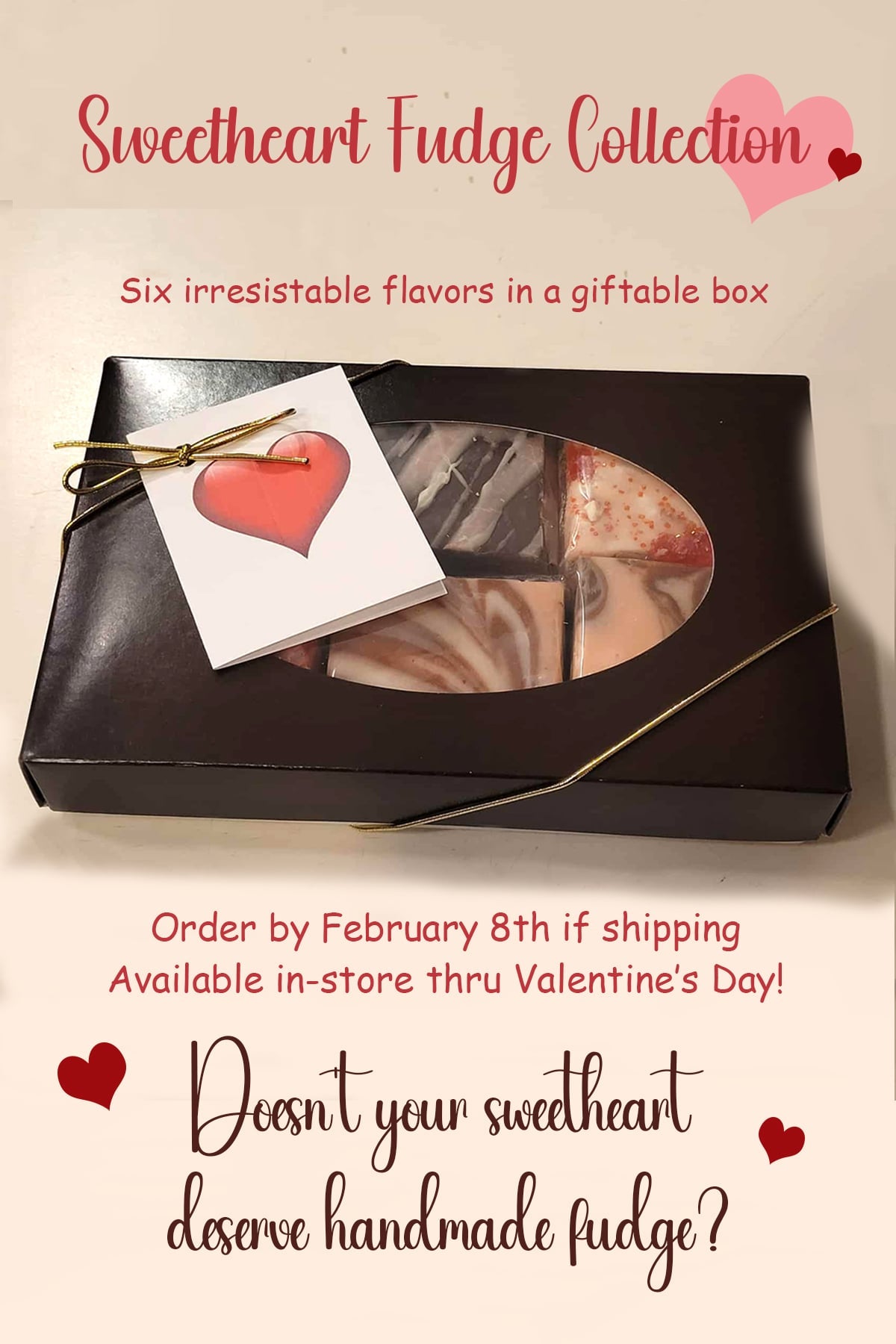 Send one of our gift boxes of Fudge or chocolates to your friends or family. Perfect for any occasion. 2 to 3 day delivery by USPS Priority Mail.