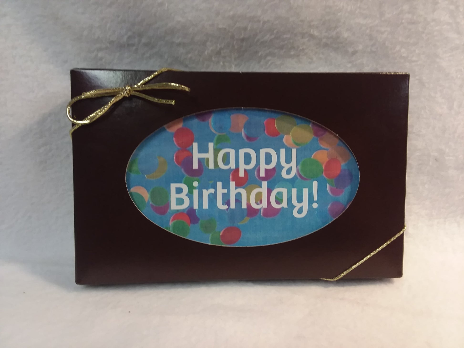 Balloon Happy Birthday fold over card is included in the box. If you would like a message on the inside of the card, please enter it in "Special Instructions for Seller" on the shopping cart page. Since most of these boxes are assortments, please indicate if you have nut or food allergies.